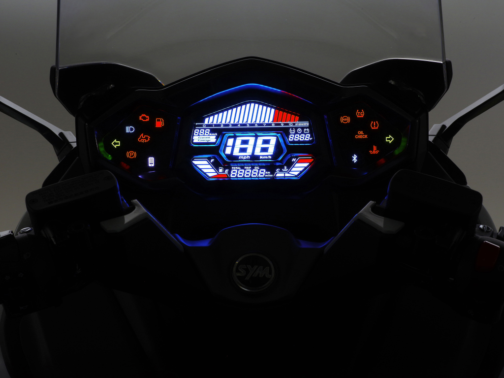 Por otro lado, su frontal es moderno y deportivo con ópticas LED, con inspiración superbike según la propia SYM. Para reforzar esta imagen deportiva, cuenta con una amortiguación muy evolucionada denominada “Adjustable Centered Suspension Multi-link”. Se trata de un amortiguador trasero con una especie de violeta que le proporciona gran progresividad, y su idea es lograr una adaptación rápida a cualquier tipo asfalto y velocidad, ya sea una zona bachea da o buen asfalto a ritmo rápido. Delante instala un horquilla invertida que se une a un chasis corto de 1 punto 150 mm para lograr un reparto de pesos como una moto, 50% en cada tren.