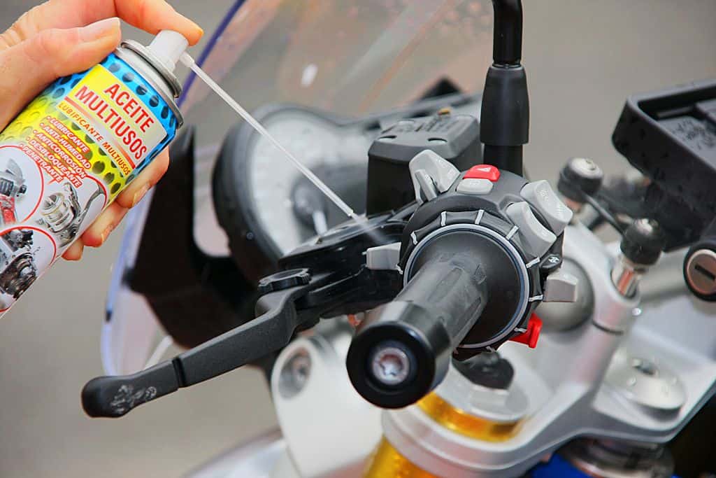Después de haberla lavado o si estado rodando un buen rato bajo la lluvia o la nieve, el agua o quizá solo humedad puede haber entrado en las zonas más íntimas de tu moto, con lo que te pueden dar algún problema eléctrico, algún simple encaje mecánico como son las cerraduras tanto del contacto como del asiento o en el cable del embrague a la altura de la maneta.