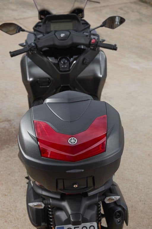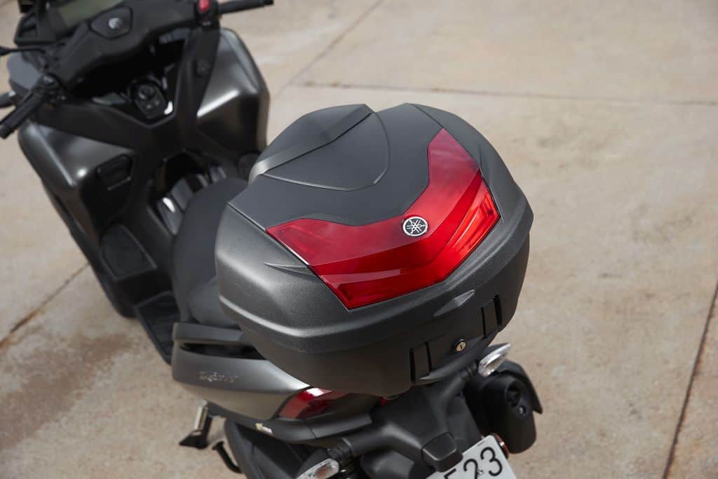 Además, cuenta con elementos que ya le hemos visto en otros scooters Yamaha como (entre otros) los T Max, que es la llave inalámbrica y todas las funciones de la moto agrupadas en un mando situado donde normalmente estaría la cerradura. Así podemos abrir desde allí el depósito, el asiento, activar el bloqueo y la puesta en marcha. Por último, no conviene olvidar en absoluto el buen hueco bajo el asiento, donde cabe un casco integral grande más uno abierto pequeño, además de varios pequeños objetos más ¿Quieres más?, pues tiene guanteras laterales con una toma de corrriente.