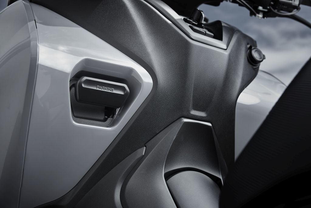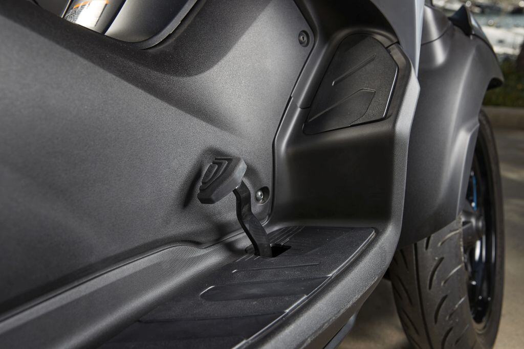 Además de esto, este Tricity 300 se incorpora un sistema de bloqueo del tren delantero para poder aparcarlo e incluso poder parar en los semáforos sin poner los pies en el suelo. Se trata de una pinza de freno que bloquea todo el sistema de basculación de las dos ruedas delanteras. De ese modo, el tren delantero se queda bloqueado y, combinándolo con el freno de mano, queda perfectamente aparcada.