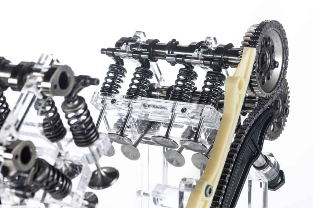Además, gracias al cigüeñal contrarrotante con muñequillas caladas a 70°, se reducen espectacularmente las vibraciones puesto que a girar al revés las compensa, y por otro lado logra una moto mucho más ágil y manejable al conversar la inercia del sentido de la marcha. Y por si fuera poco, las muñequillas a 70° (con explosión a 0,90, 290 y 280°) además también consiguen que suene igual que un bicilíndrico… Como debe ser en una Ducati.