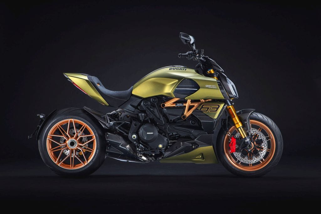Como todos sabemos, los fabricantes “premium” son muy aficionados a presentar series limitadas o aniversario con cierta frecuencia. En este caso, Ducati se ha aliado con el fabricante de coches que todo hemos soñado alguna vez, Lamborghini, que partiendo de una Diavel se han inspirado en el Sián FKP 37, coche del que por otro lado sólo se han fabricado 63 unidades. Así, esta moto se ha diseñado entre el Centro Stile Lamborghini y el Centro Stile Ducati utilizando materiales nobles y la pintura especial característica del Sián como es el verde «Gea Green». Por otro lado, para que destaque el bastidor, el colín y las llantas se ha usado el color oro «Electrum Gold».