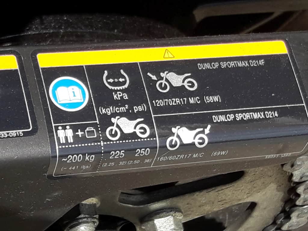 Y dependiendo del fabricante, sobre todo si son americanos, encuentras distintos datos. Para empezar, los códigos de homologación nos recuerdan a la de los cascos, que son DOT los americanos y E continuado del número (4) si son europeos, y también te pueden indicar si son neumáticos exclusivos de moto con el código “MC”. Por otro lado, si son especiales para barro o nieve (o sea, Mud y Snow en inglés) del indica poniendo “MS”. Algunos, aunque yo eso apenas lo he visto en neumáticos de moto, también incluso te pueden indicar las presiones máximas con leyendas como “Max Load 300 kg at 45 PSI cold”, que traduciéndolo al cristiano quiere decir que tiene una carga máxima de 300 kilos a 45 libras por pulgada en temperatura fría. Bueno, en este caso está claro que, para enterarte bien, las 25 libras deberías convertirlos en kilos, que te saldrían unos 20,4.