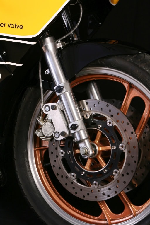 Aproveché, como no, para montar unos cuantos componentes pata negra de la época, como las estriberas Tarozzi, los semimanillares, y también para mejorar algunos puntos flacos de la RD como la frenada, que se mejoró montando una bomba de Triumph Speed Triple y unos discos de freno de Yamaha R1. Mantuve las pinzas de serie para dar un acabado “Old Style” a toda la moto. Ya que iba a ser una réplica de una moto de finales de lo 70, no quería montar componentes demasiado modernos.