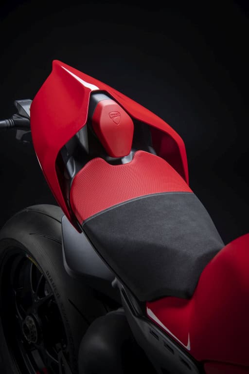 Así, el motor Desmosedici Stradale de 1.103 cm3, aumenta su potencia ligeramente, sobre todo gracias a la reducción de rozamiento internos con nueva bomba de aceite, colectores de mayor diámetro, etc. así, tiene una potencia máxima de 215,5 cv. A 13.000 revoluciones lo que supone un 1,5 más que antes. Claro que con sus cuatros modos de motor-Full, High, Medium y Low- se puede llegar en este último a 150 para disfrutar tranquilamente de un motor suave y progresivo. Pero si, por otro lado, buceas en el catálogo Ducati Performance… ¡La cosa cambia! Con el escape Akrapovic de titanio puedes llegar a los 228 CV, además de bajar cinco kilos el peso. Por supuesto, toda la electrónica se ha retocado para lograr estas nuevas prestaciones, además del depósito que ahora tiene 1 l más con una nueva ergonomía mejorada para un mejor pilotaje.