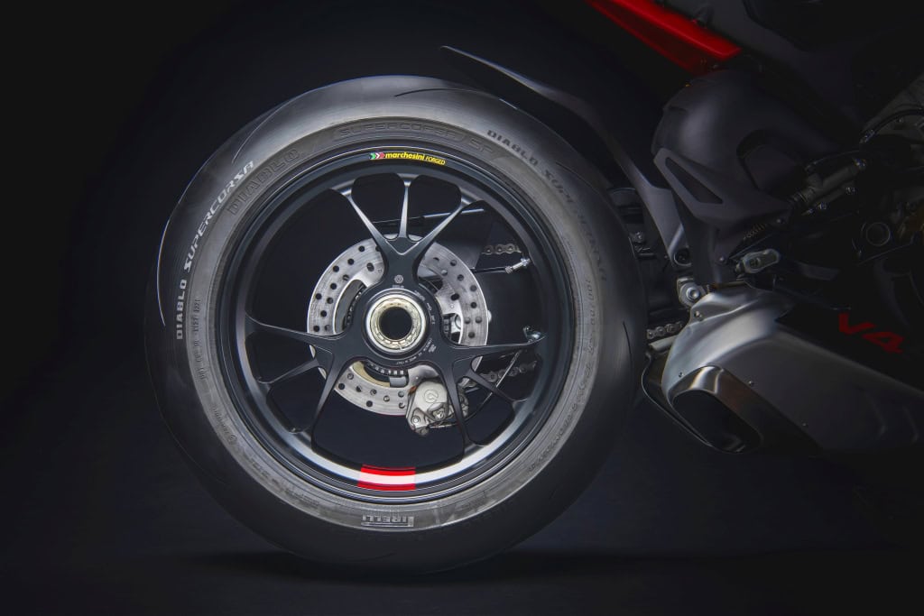 Los desarrollos también han cambiado, alargándose en primera (11,6% más), segunda (5,6% más) y sexta. O sea, más enfocada al circuito. En cuanto a la amortiguación, la horquilla presurizada Öhlins NPX 25/30 tiene 5 mm más de recorrido que la anterior Panigale V4 (125 mm en total). En la versión estándar se sustituye toda la equipación Öhlins por una horquilla Showa BPF de 43 mm y amortiguador trasero y de dirección Sachs.