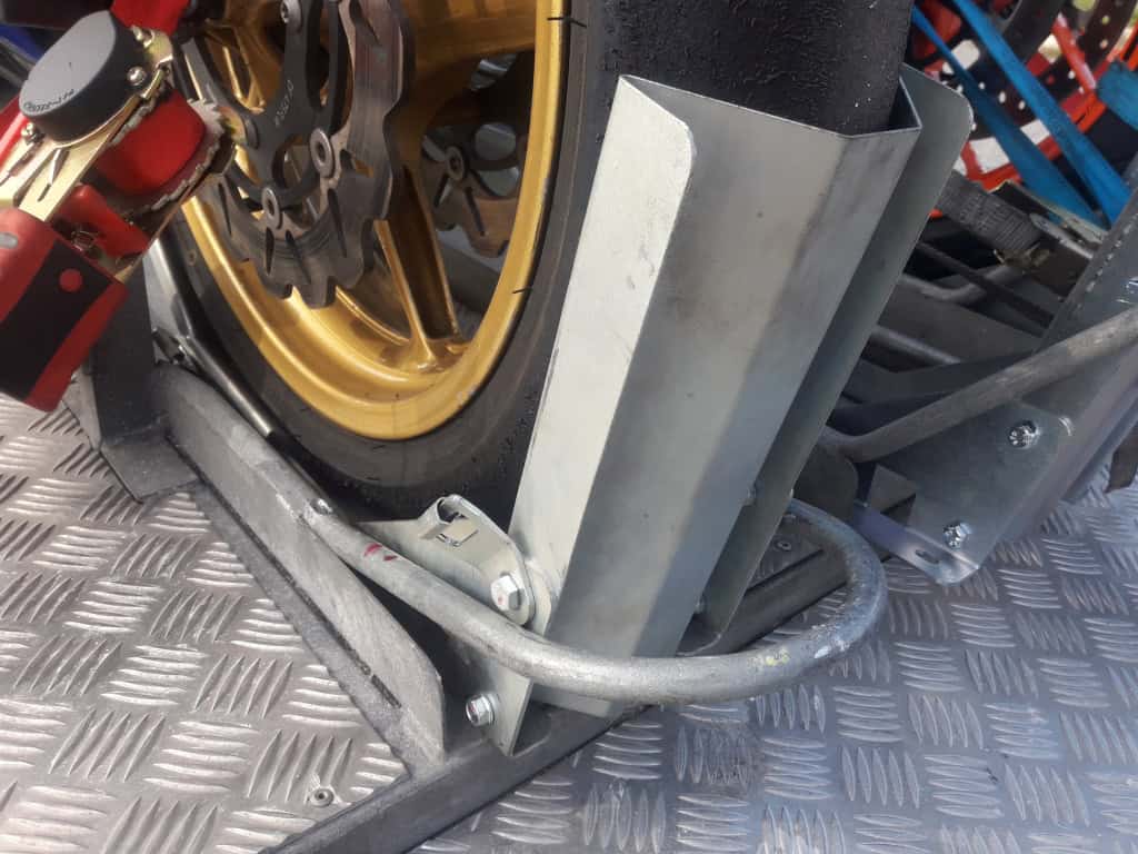 De todas maneras, lógicamente, consideremos que con la moto vertical se estabiliza el peso sobre el remolque, además de que, si subes dos motos, ambas deben ir totalmente verticales para que quepan bien. Para esto, o bien tienes un buen amigo que te la mantenga recta mientras la fijas o, si lo haces sólo, en los últimos años ha aparecido un invento fantástico que son los bloqueadores de rueda delantera, o también comúnmente llamado “calzos”. Es un soporte para apoyar la rueda delantera, con un balancín trasero que, al paso del neumático, bascula y la deja bloqueada. En esta foto puedes ver cómo es durante el proceso de instalación en un remolque. De este modo, la moto queda segura para ir fijando las cinchas, aparte de ser un buen extra para asegurar la rueda delantera durante el viaje.