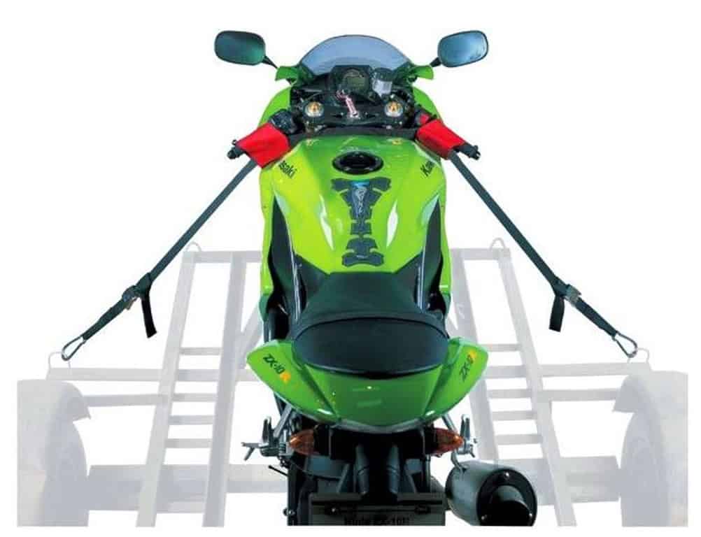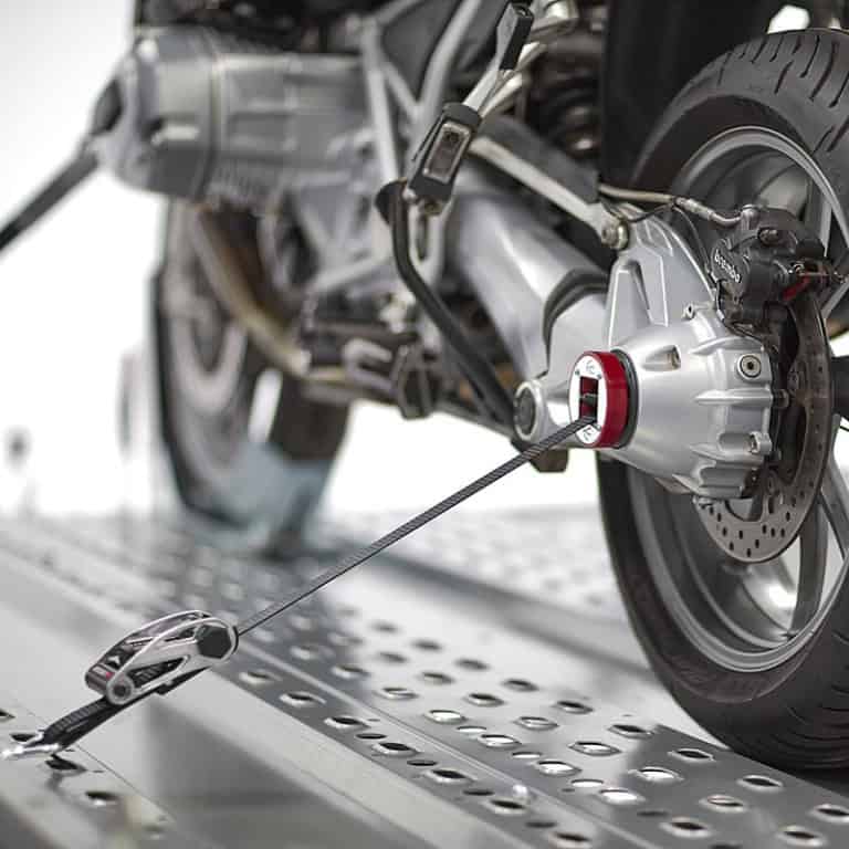 Para lo que es propiamente fijar la moto, lo normal es usar cuatro cinchas, dos para rueda delantera y dos para la parte trasera. Para ello, la lógica indica que la cinchas han de anclarse a un punto elevado, sobre los manillares y por el subchasis trasero, porque de esa forma se hace más fuerza. Y es cierto, se hace más fuerza… pero no. Esta vez la teoría no está muy acertada, porque si el punto de fijación está por encima de las amortiguaciones, la horquilla y el amortiguador trasero se mantienen muy presionados durante las horas que dura el viaje, y eso tiende a ir forzando y destensando las cinchas y, no menos importante, a fatigar ambas amortiguaciones. Al mantenerlas comprimidas, tanto el sistema hidráulico como los muelles se mantienen horas y horas hundidos, lo que puede derivar en averías y/o roturas de retenes o hidráulicos interiores, aparte de la fatiga de materiales que supone para un muelle mantenerse comprimido tanto tiempo. Por lo tanto, lo más recomendable es que la cinchas pasen justo los lados de los ejes delantero y trasero. Aquí puedes tensar todo lo que necesites con el trinquete de forma que la moto no se mueva en absoluto y sea totalmente seguro.