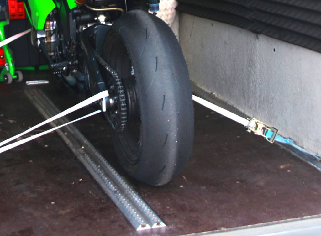 Cuando subes la moto sobre la plataforma del remolque, la colocas en el punto en que vas a fijarla (por eso personalmente recomiendo no tener carriles instalados, o quitarlo si los tiene, porque así es más fácil poder moverla, y evitas que las ruedas se suban a las elevaciones laterales) y, antes de empezar a poner la cinchas, lo mejor es que esté vertical, aunque si transportas una moto de calle también puedes dejarla sobre la pata lateral y fijarla inclinada. No obstante, las motos de circuito, que a la muchas les quitan las patas de cabra, esto no es posible.