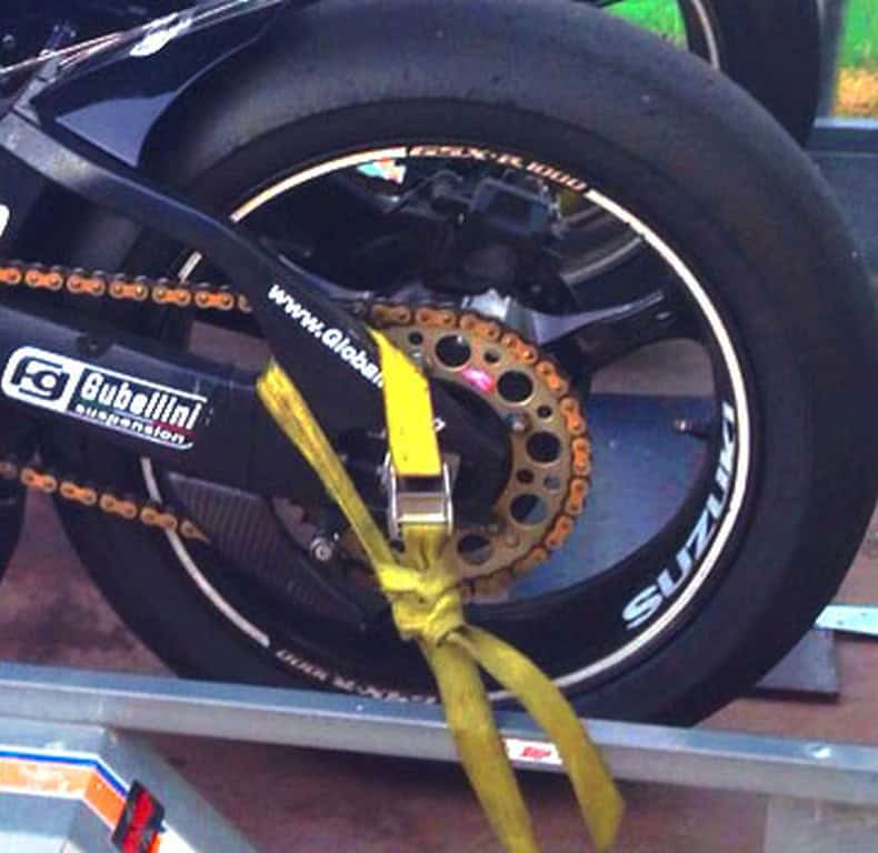 Por supuesto, aquí hay que estar muy atento a no fijar la cinchas a ningún punto deformable, como puedan ser los anclajes de las pinzas radiales, la araña o la pista de los discos de freno, los anclajes de los reposapiés traseros (que también se pueden partir y son muy maleables), al mismo escape o la corona de transmisión detrás… Que aunque todo esto parece muy lógico, no es raro ver cosas así en cualquier rodada cuando ves a los menos experimentados. También puedes verlo en las fotos de nuestra galería.