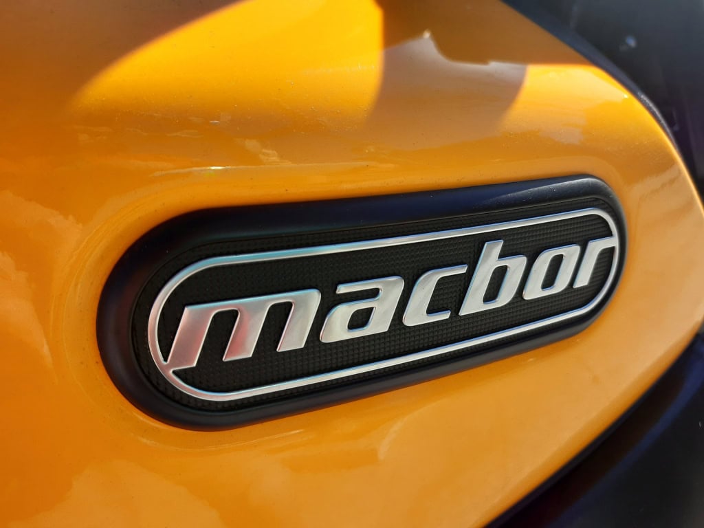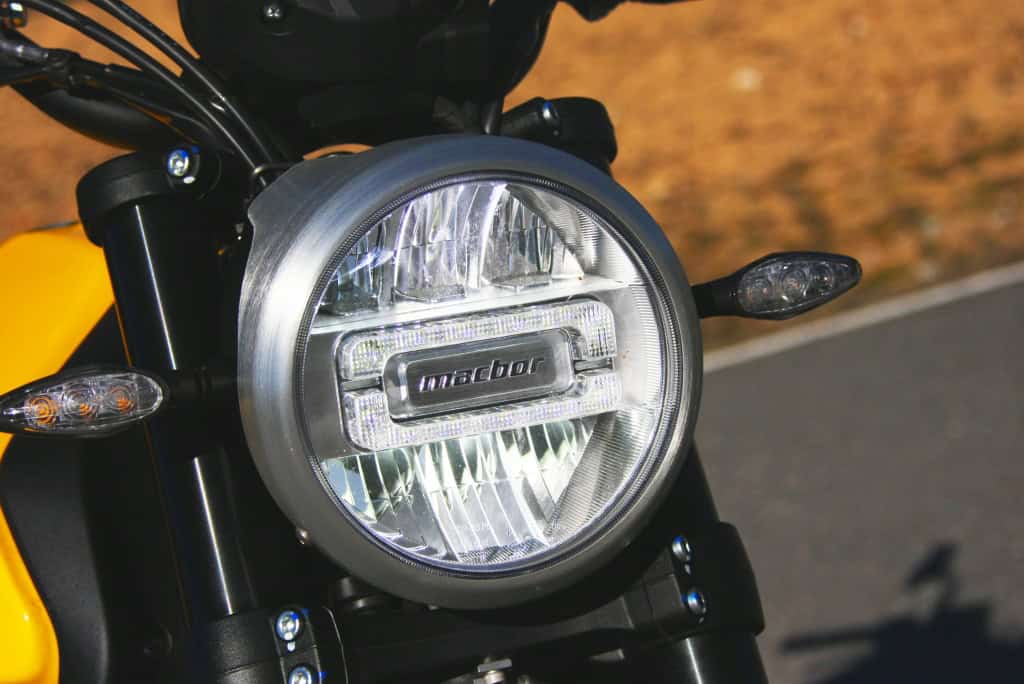 Nada más presionar el botón de arranque el motor cobra vida ronroneando como un gatito. A pesar de, por supuesto, pasar holgadamente la norma Euro 5, el control de la termodinámica interna para arrancar y tener un tacto excelente a bajas y medias revoluciones, algo de lo que pecan muchos otros modelos y motores con tiempo de diseño sus espaldas. Y este buen trabajo está directamente hecho por el desarrollo de la propia marca, como el de otras que también han adquirido y comercializan este motor Honda–Loncin en sus trail o naked medias… solo que el grupo Bordoy, dueño de Macbor, parece haberlo hecho mejor. Precisamente en bajos y medios, en otros muchos modelos las notas un tacto un tanto, digamos, errático. En cambio aquí es todo suavidad, progresividad y un motor lleno y siempre dispuesto a responder a tu giro acelerador incluso regímenes muy bajos. Así, la “catalización Euro5” no parece haberle afectado y puedes ir estirando marchas, de forma que nunca notarás ni baches ni falta de empuje incluso en pilotaje moderadamente deportivo.