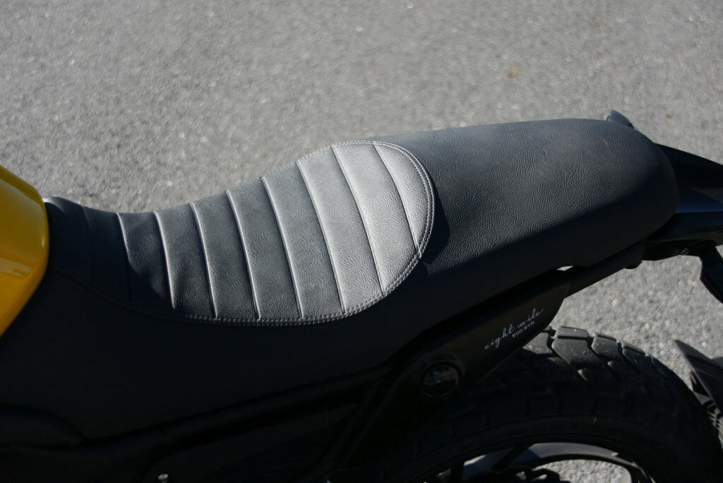 ¿Te gusta el turismo? Pues su motor puede con peso, y solo tendrás que endurecer el muelle trasero (tiene un tacto muy seco si lo aprietas a tope) si llevas alforjas o pasajero para rutear con bajos consumos, sin vibraciones y capaz de mantener buenos ritmos de mototurismo tranquilo sin sentirse “flojo” subiendo puertos, aunque lleves carga, con una velocidad máxima que rondaría los 180… si no ruedas en carreteras españolas, claro… que la Guardia Civil está siempre esperando. Mientras, en ciudad se muestra ligera (porque lo es) y manejable a pesar de la llanta delantera “grande” de 18 pulgadas. Además, estrecha de asiento, pero muy bien acolchado, hace de la Eight Mile STR una moto muy cómoda
