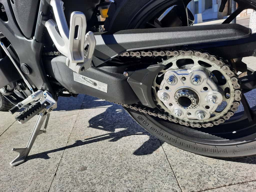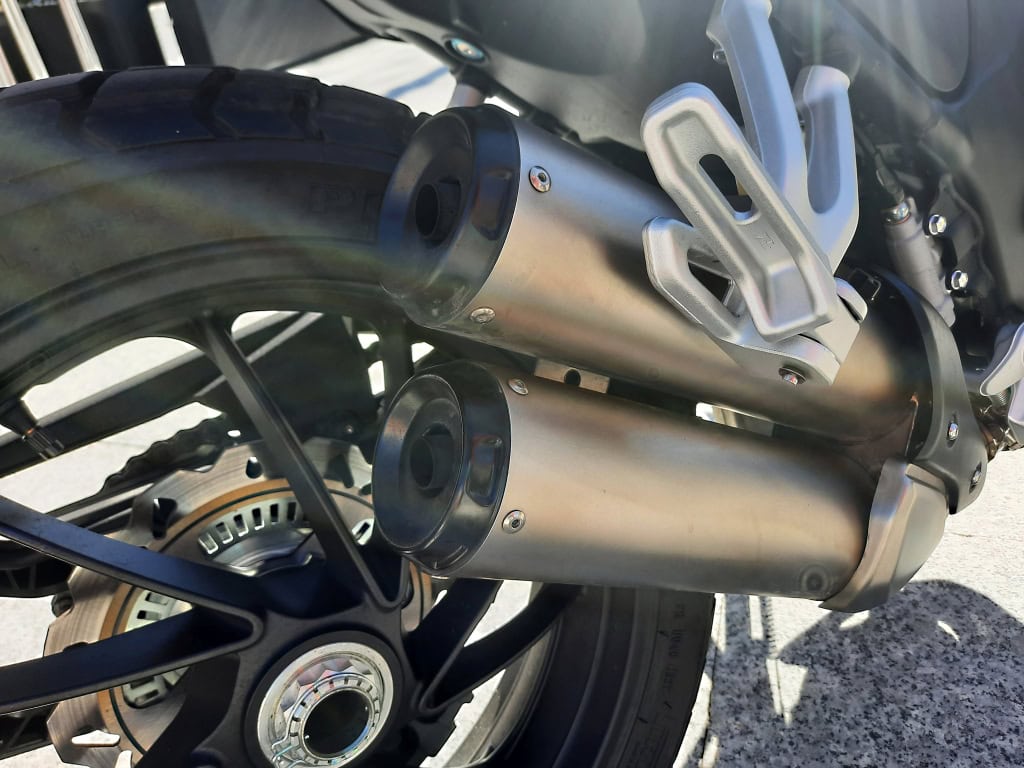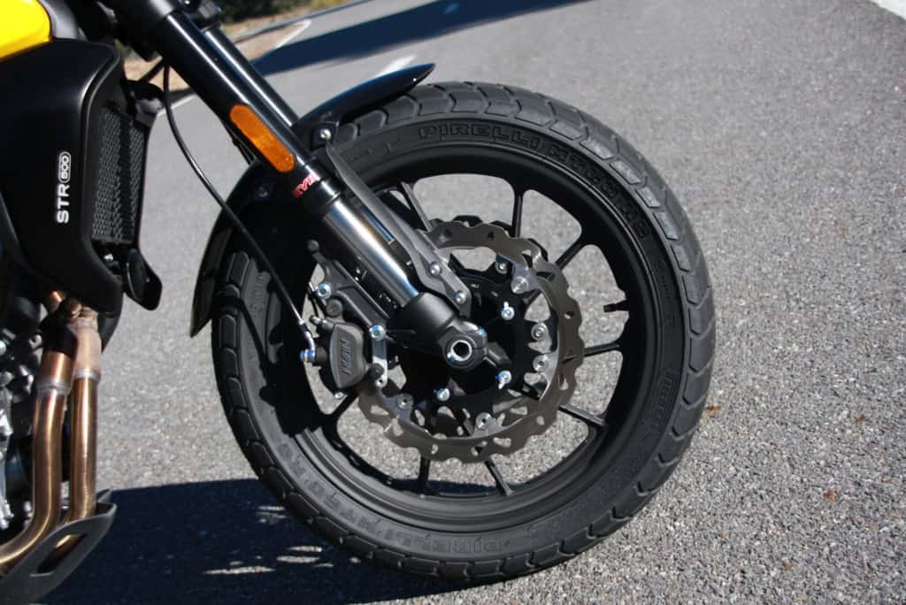 Lo mismo ocurre si se te aventuras en algún camino muy sencillo, qué es para lo que estaría pensada esta STR con llantas de aleación equipada con Pirelli MT60 , ruedas con tacos anchos y cortos. Clásico neumático de trail muy asfáltica, que cumple en sencillas incursiones “off road”… Justo como debe ser una Scrambler.
