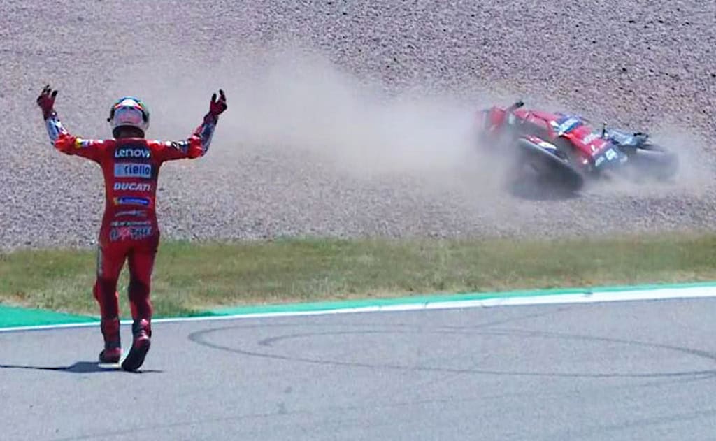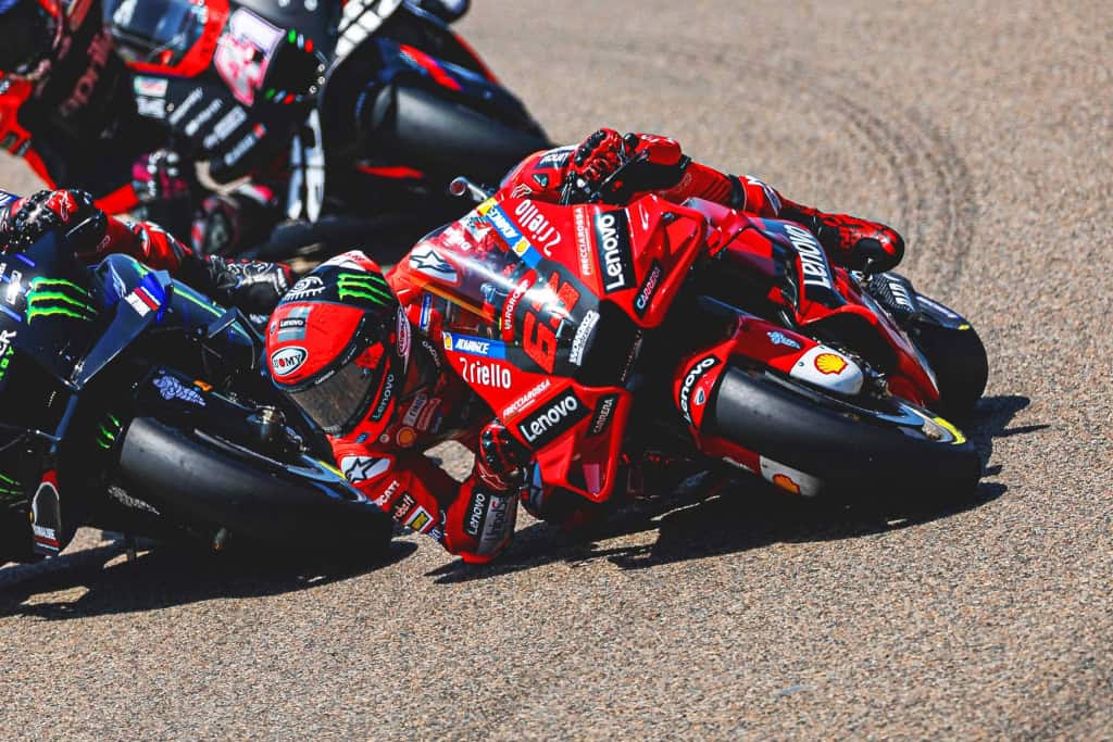 Tanto Pecco como Fabio salieron a tope sabiendo que prácticamente se están jugando el campeonato. Por detrás, se colocaban Zarco y Aleix Espargaró en su persecución, pero entre los dos primeros se presuponía una lucha épica que, sin embargo, duró muy poco. Al inicio de la cuarta vuelta Bagnaia perdió el agarre de los neumáticos y cayó, lo mismo que le ocurriría a Joan Mir con la Suzuki, un equipo que lleva sufriendo un hundimiento imparable desde que anunciaron a todos sus componentes el abandono de la competición para el año que viene. Alex Rins no corría por lesión, y Joan Mir tuvo que abandonar la carrera. Pero no sólo él, sino después Nakagami y Alex Márquez, ambos equipos satélites de Honda, también cayeron. Por otro lado, más tarde por el Espargaró, el único representante del equipo oficial Repsol Honda, tuvo que abandonar la carrera por dolores de las dos caídas de entrenamientos del viernes.