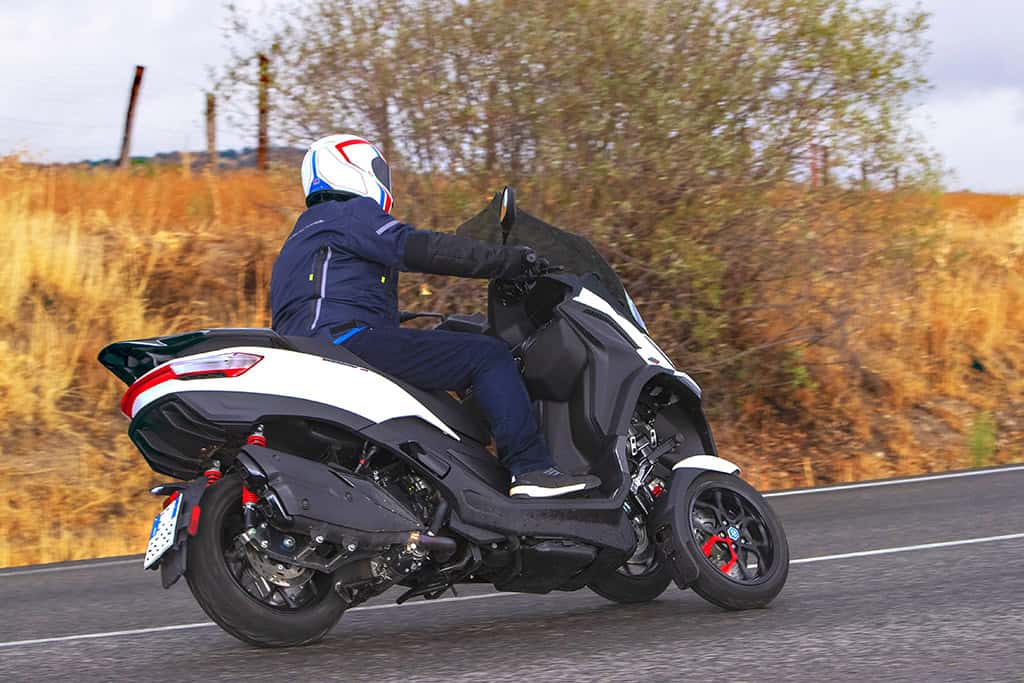 El motor, monocilíndrico que proviene del anterior 350 pero que ha crecido hasta 400 cm³ reales, por otro lado, se nota mucho más “fuerte” que en otros modelos. Me refiero a que recupera y sube puertos mucho mejor que antes con sus 35 cv (o 26 kW, como prefieras) declarados, y un par de 37.7 Nm a 5750 rpm. Al aparcar, con los habituales sistemas de freno de mano y el bloqueo de las tres ruedas, generalmente nunca usarás el caballete central. Sin duda, esta es uno de las grandes ventajas de los MP3.
