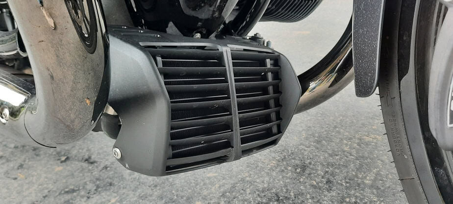 Pues, a pesar de su apariencia claramente gigantesca y retro, por dentro si que tiene soluciones de última generación para poder ser lo suficientemente suave para poder conducir por carretera y, además y por supuesto, para pasar todas las normas anti polución que sufrimos en Europa. Así, y a pesar de contar con refrigeración por aire y aceite (no de agua) por lo que delante cuenta sólo con un pequeño radiador, tiene un cigüeñal forjado en acero endurecido para poder soportar el empuje de sus bestiales bien las con un cojinete en el centro, con unas varillas de empuje realmente cortas y cuatro válvulas por cilindro. Visto de cerca, las culatas de las tapas de balancínes son impresionantemente masivas y en este modelo, además y como gran parte del resto de la moto, pintadas de negro.