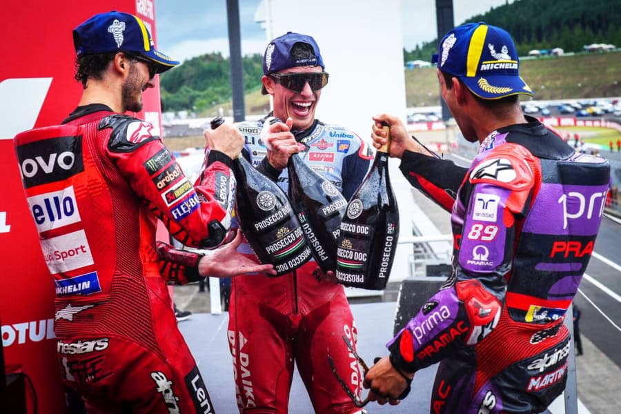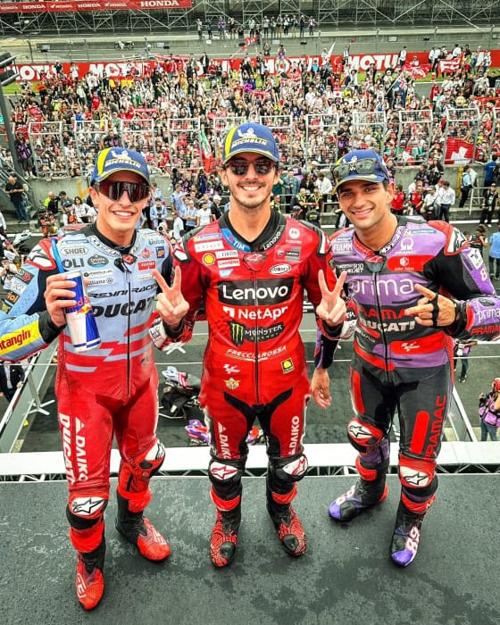 Acosta sufrió el mismo problema que la primera carrera, sufriendo otra caída estaré rodando segundo. Así, la cabeza la formaban Bagnaia, Martín y Marc Márquez detrás. Jorge buscaba desesperadamente logra alcanzar a Bagnaia, pero la lluvia empezó a ser más fuerte y sacaron la bandera blanca para poder cambiar las motos. Nadie se decidió por esto, pero Bagnaia saca algo de ventaja a Martín, que apretó lo que pudo las últimas tres vueltas para recuperarle, y logró rodar a menos de un segundo, y por detrás de ellos la guerra estaba entre Márquez y Bastianini. Y así fue como llegaron a meta, por lo que el podio lo compusieron Bagnaia, Martín y Márquez tercero. Aquí tienen los resultados detallados de esta carrera.