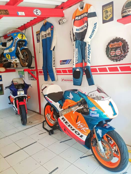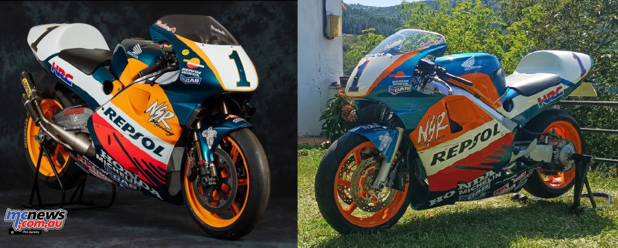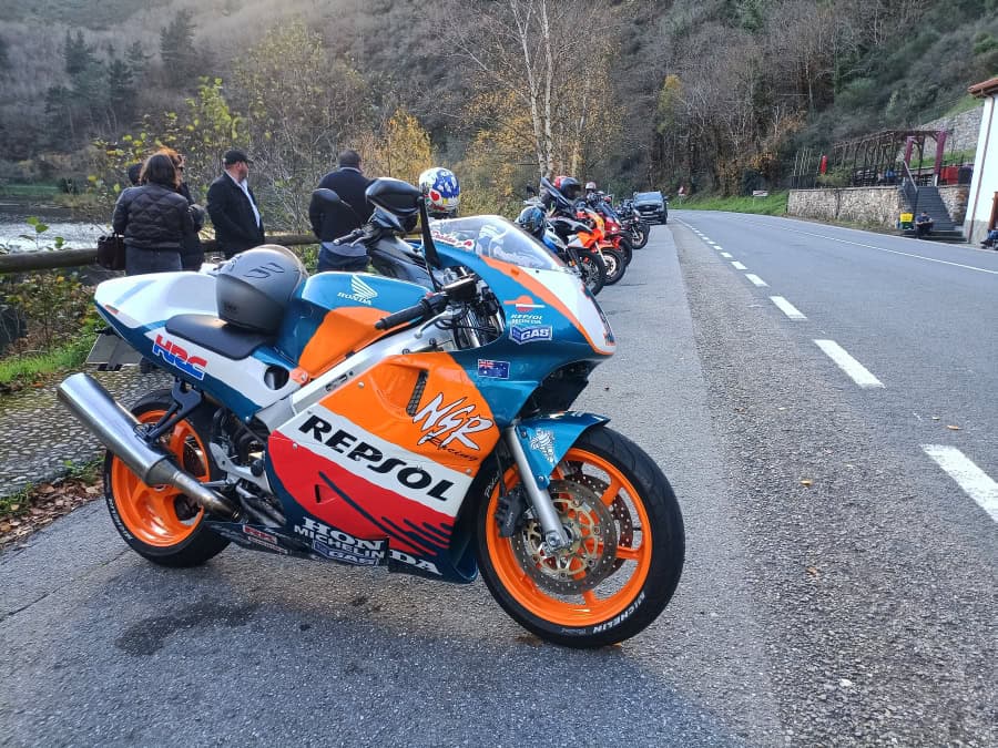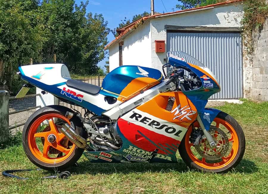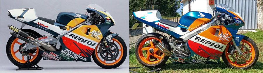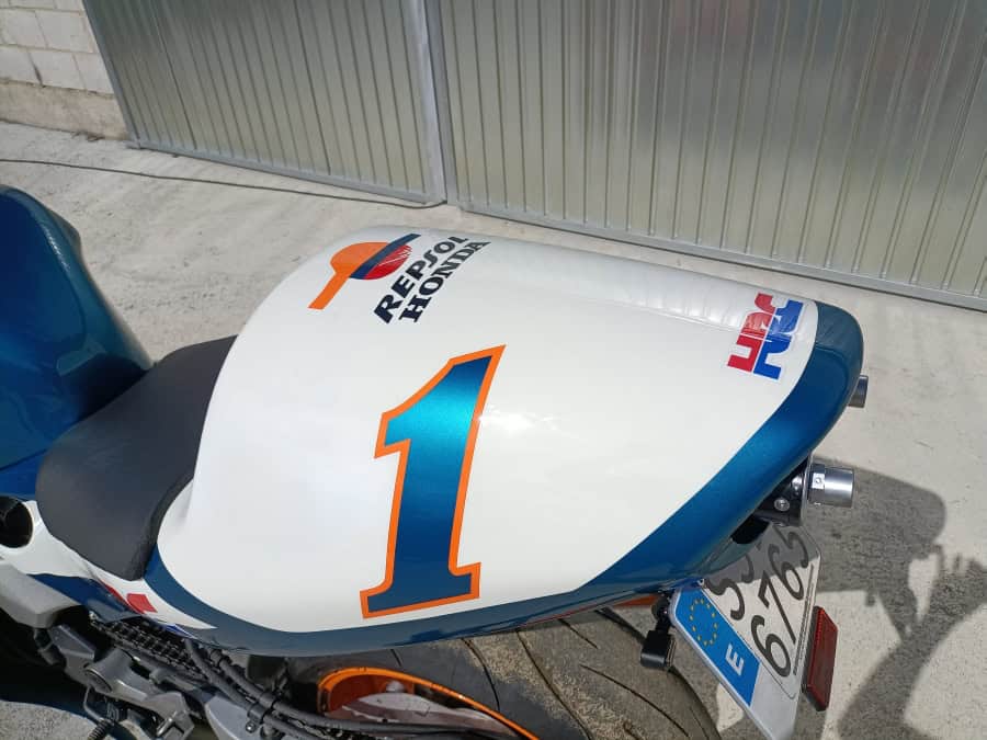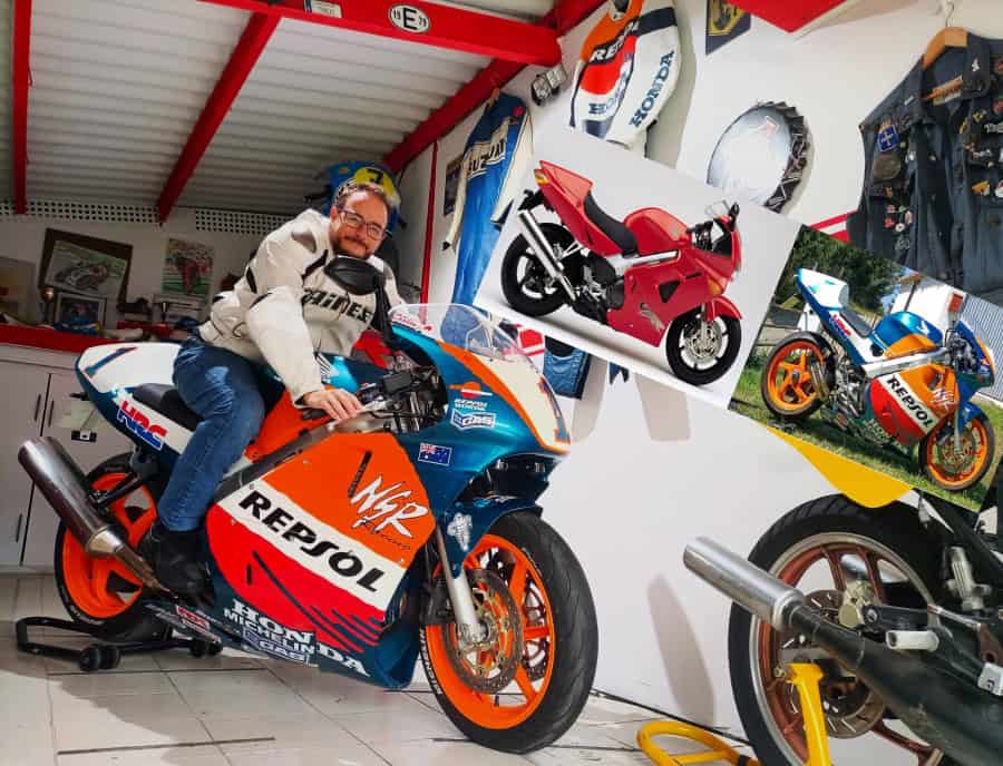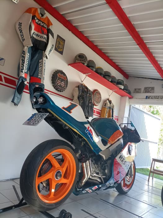 Hablo de Javi Fernández, al que conocí hace ya varias décadas cuando se dedicaba solamente a decorar cascos. Desde entonces, cambió su residencia de Madrid a Asturias y nos seguimos viendo en concentraciones y similares. Hace un tiempo me envió una preciosa transformación sobre una base de Yamaha RD 350 para ser una YZR 500 del mismísimo “The King” Kenny Roberts, y ahora ha tocado el turno de convertir a una tranquila y casi señorial Honda VFR 800 en una explosiva, seductora y casi magnética Honda NSR 500 Repsol Honda Mick Doohan Réplica. Otra maravilla hecha a base ilusión, ingenio y ¡mucha maña!