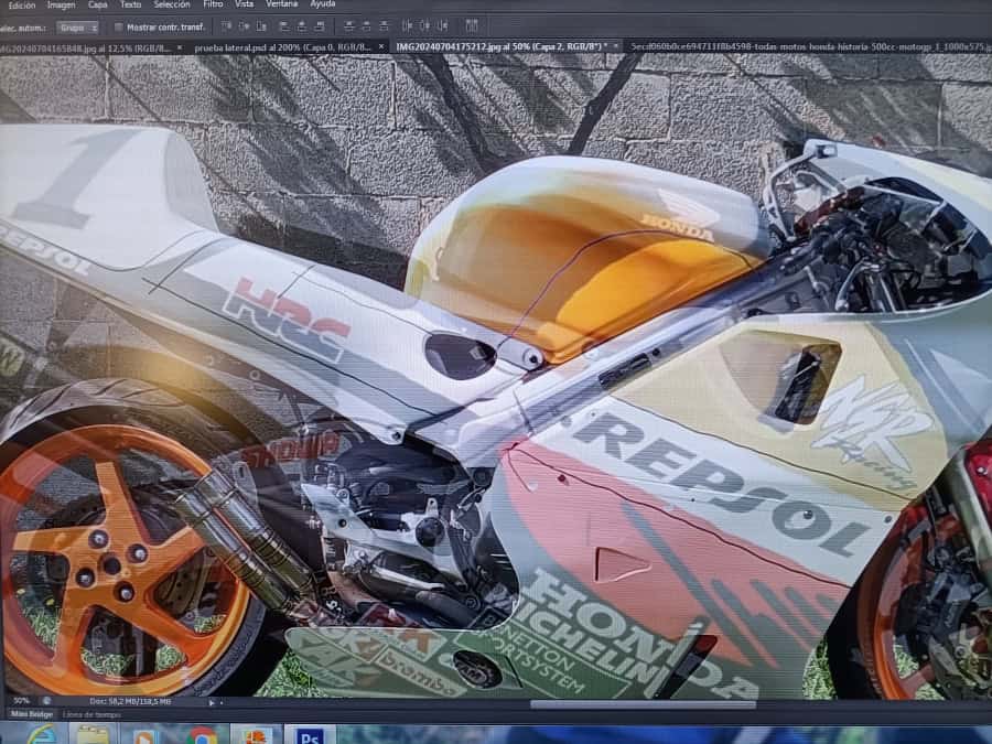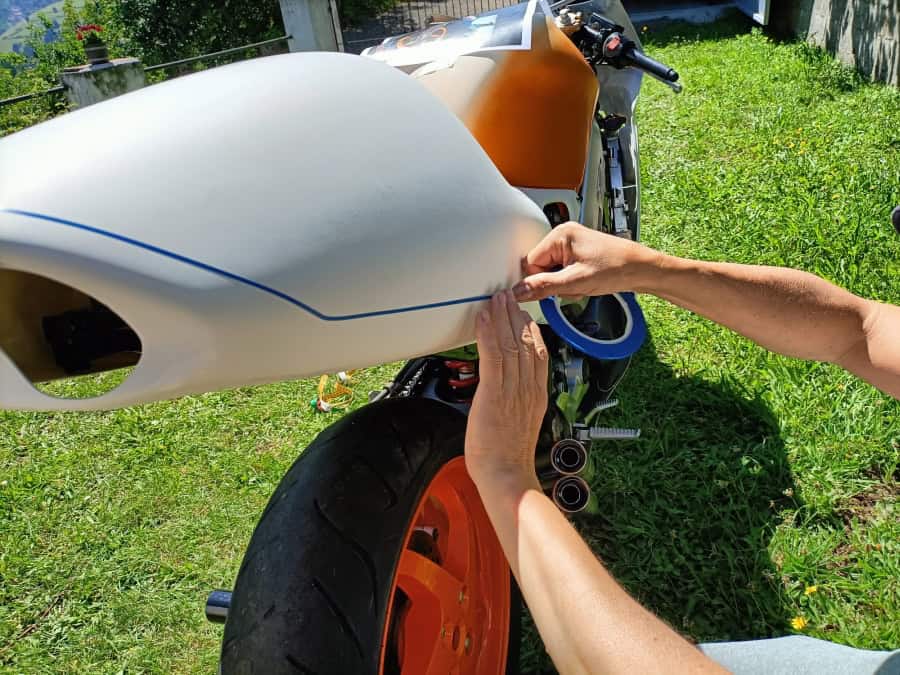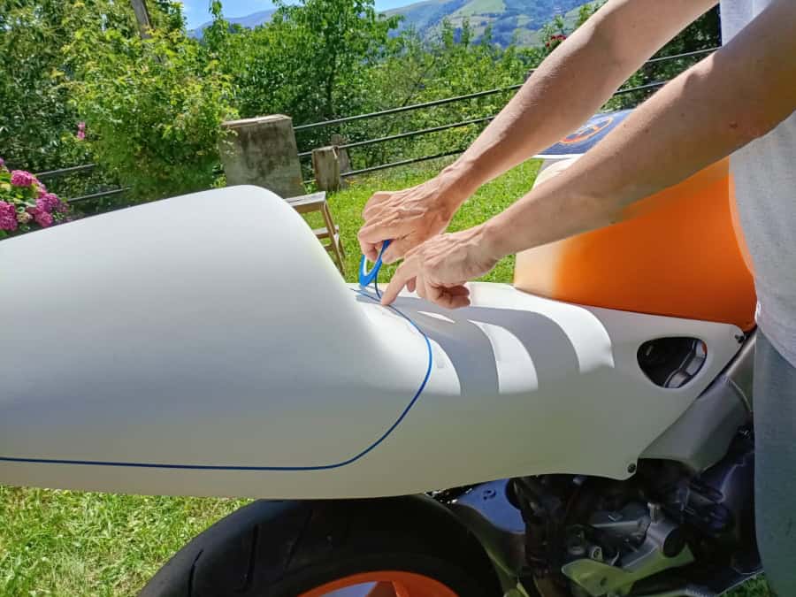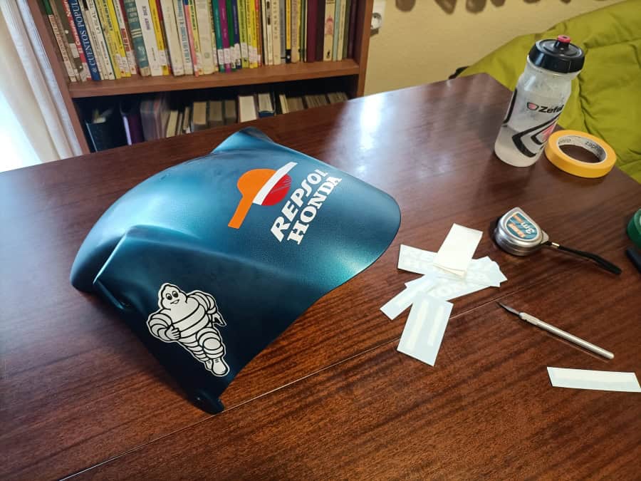 Para conseguir que las líneas y los logotipos coincidieran todo lo posible con la original (recordar que los carenados son ahora más altos para que entrase el chasis) hice un proceso complicado, pero efectivo. Tracé las líneas de cada color sobre los carenados en blanco, y haciendo fotos del resultado las fui comparando en el ordenador con la moto real, usando una transparencia en PhotoShop como puedes ver en esta foto. Tras un día entero de pruebas, al final las líneas estaban marcadas. Con las líneas en su sitio, se midió todo para hacer los adhesivos a medida, imprimiendo primero en papel para descartar errores, y más tarde ya en vinilo.