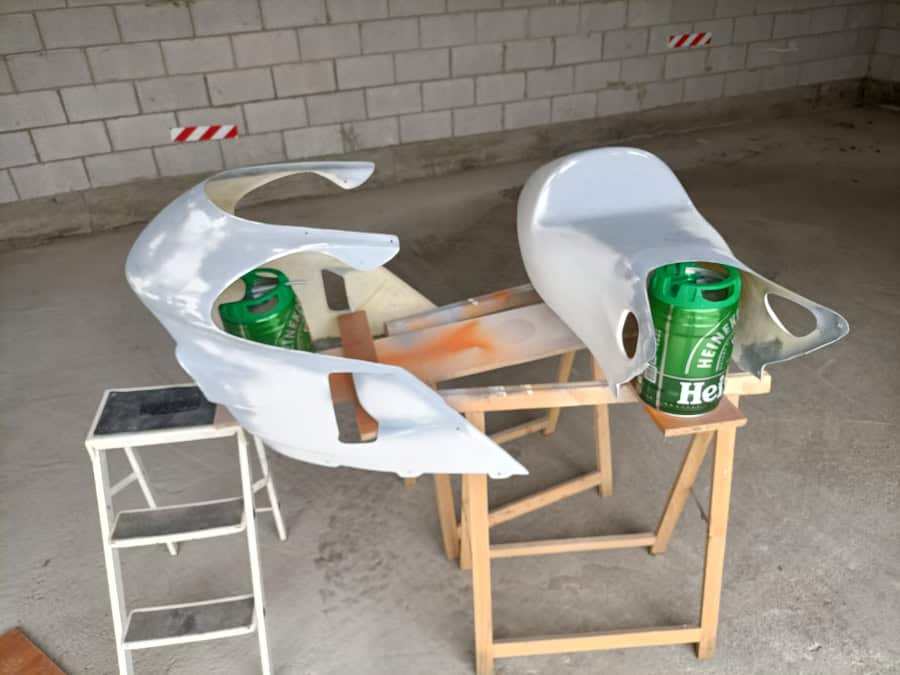 Con el radiador y los manillares en su sitio, busqué un kit de carenado completo de NSR 500 y comencé a adaptar. Solo adaptar el frontal llevó varios meses, haciendo ensayos con varias piezas antes de dar con la definitiva. El colín fue la parte más fácil, encajando bastante bien sobre una placa de acero fabricada a medida, pero la quilla necesitó muchas horas de ajuste para encajar los colectores y, sobre todo, la pata de cabra, que debía quedar lo más escondida posible, sin dejar de ser funcional.
