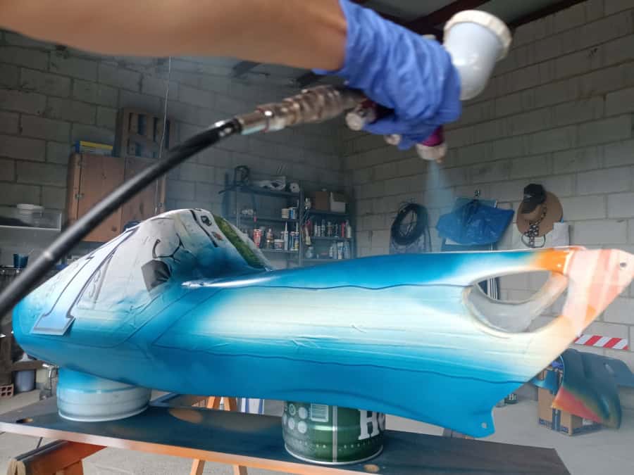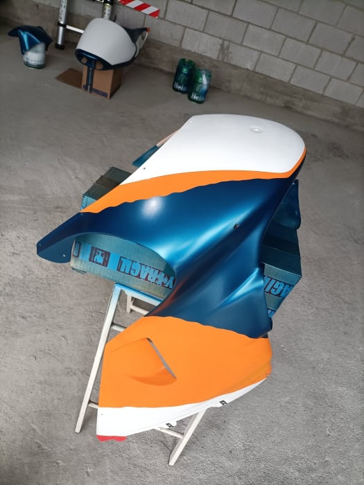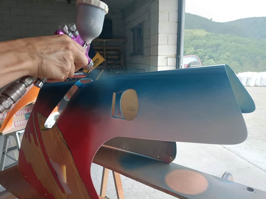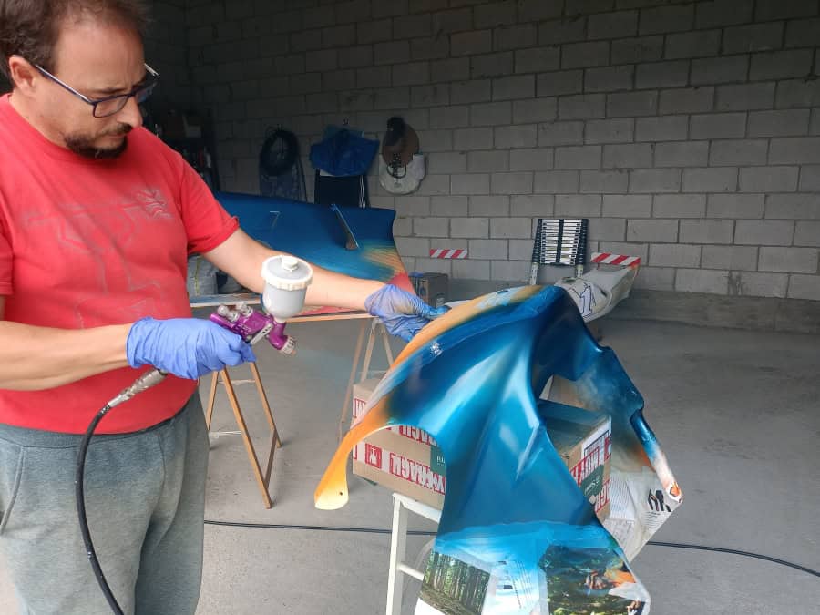 Para la pintura se usó un proceso largo, pero que da una calidad muy alta. Se pintaron los colores base en pintura monocapa de alta calidad, cada color se dejó secar al menos una semana, y se barnizó por encima antes de dar los adhesivos. Un nuevo lijado muy fino, y tras poner los adhesivos se volvió a barnizar. Es un proceso que tarda meses, pero que da una calidad y una profundidad al color que ningún proceso rápido puede conseguir. Toda la pintura está hecha el garaje de casa, nada de cabina de pintura profesional, ya que no dispongo de ninguna, pero las fotos hablan por sí mismas.