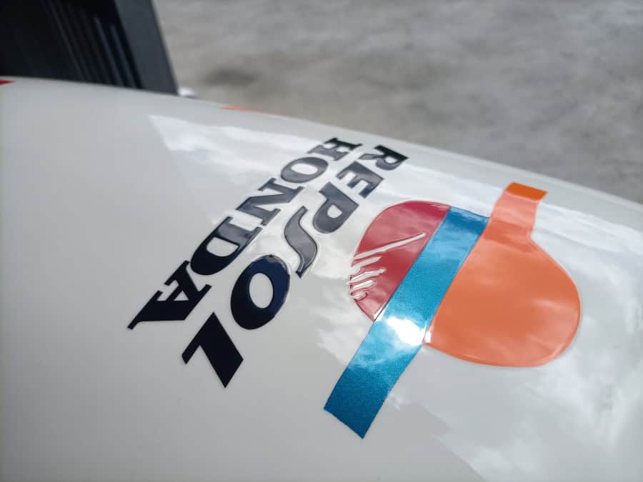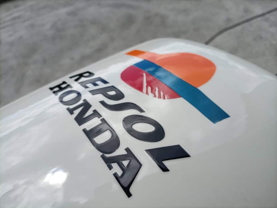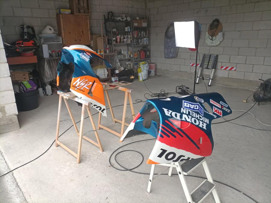 Vale, ya tenemos las fibras en su sitio. Ahora toca buscar la perfección. ¿Qué hace que una réplica esté a un nivel superior? Sin duda, las proporciones. Por muchos miles de euros que inviertas en piezas de primera línea, si las proporciones de la moto no son correctas, todo el trabajo se perderá. Cuando ves una moto de lejos, el primer vistazo te va a marcar si las formas son correctas o no. En el caso de la Doohan, el mayor problema viene del depósito. En la VFR es mucho mayor y si no se hace bien, puede estropear todas las líneas. La decoración del año 99 lleva el depósito en naranja, y eso la descartó desde el principio, ya que un color tan claro en un depósito tan grande, haría que siempre fuera el centro de atención, arruinando la estética general. En cambio, la versión 98, lleva naranja solo en la parte inferior, y al poner un color más oscuro en la parte superior, ópticamente parece más pequeña.
