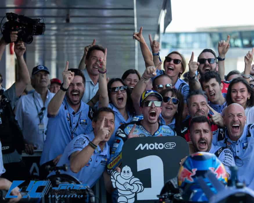 Mientras tanto, los tres primeros puestos eran de Fabio, Pecco y Alex Márquez que rodaba tercero, con su compañero de equipo Fermín Aldeguer en cuarta posición, aunque este también cayó y quedó fuera de carrera poco después. Alex logró pasar primero a Bagnaia y después al líder Quartararo en la vuelta 11, para lograr una victoria histórica por más de segundo y medio, realmente emocionante, que hizo de este uno de los mejores Grandes Premios de Jerez de la historia. Detrás, un felicísimo Quartararo que consigue su primer podio desde Indonesia 2023, y Bagnaia tercero a 2,2 segundos. Marc, gracias a una buena recuperación tras su salida y la caída de varios pilotos, logró llegar a meta el 12 y rascar cuatro puntos.
