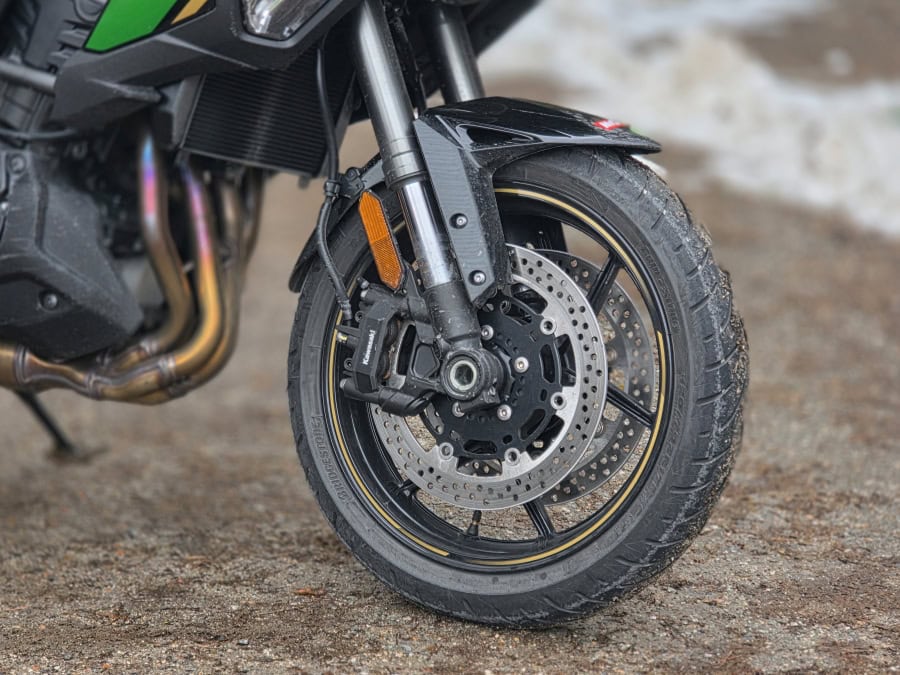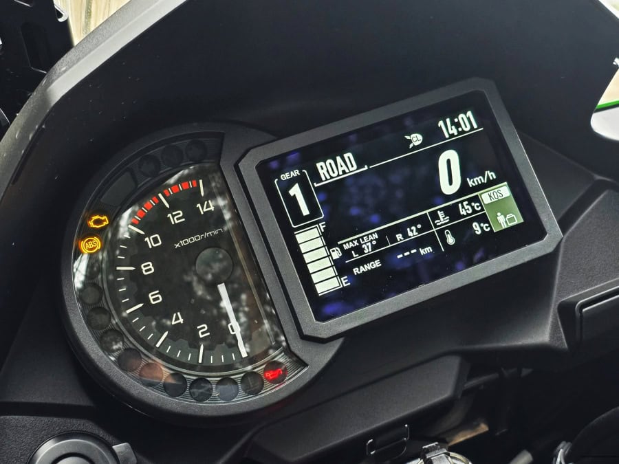Las suspensiones electrónicas Showa son, sin duda, uno de complementos que más se agradece en en ruta y, básicamente, para un uso cualquiera. Si no fijas en modo automático, la moto se adapta de forma casi mágica a los cambios de asfalto: firme cuando toca, cómoda cuando la carretera se estropea. Además, compensa los cambios de peso detrás, una de las continuas espadas de Damócles de los más ruteros que, con pasajero y maletas detrás (que esta unidad no equipaba aunque, como ves en esta foto, si tiene los alojamientos para encajar la maleta Kawa directamente, sin instalar parrilla o herrajes), se hunde mucho de atrás y reduce la direccionabilidad. Con las Skyhook, si nota más carga, se endurece, y si muchos baches, se ablanda y regula el hidráulico. Perfecto. Por otro lado, si encuentras una carretera con curvas, en conducción más alegre el modo “Sport” ofrece un aplomo notable, reduciendo hundimientos y manteniendo la moto estable. Por otro lado, los frenos cumplen incluso con mucho peso, y no tienden a hundirse tras mucho uso… aunque con el frio del invierno y uso normal en carretera es normal que no se calienten.